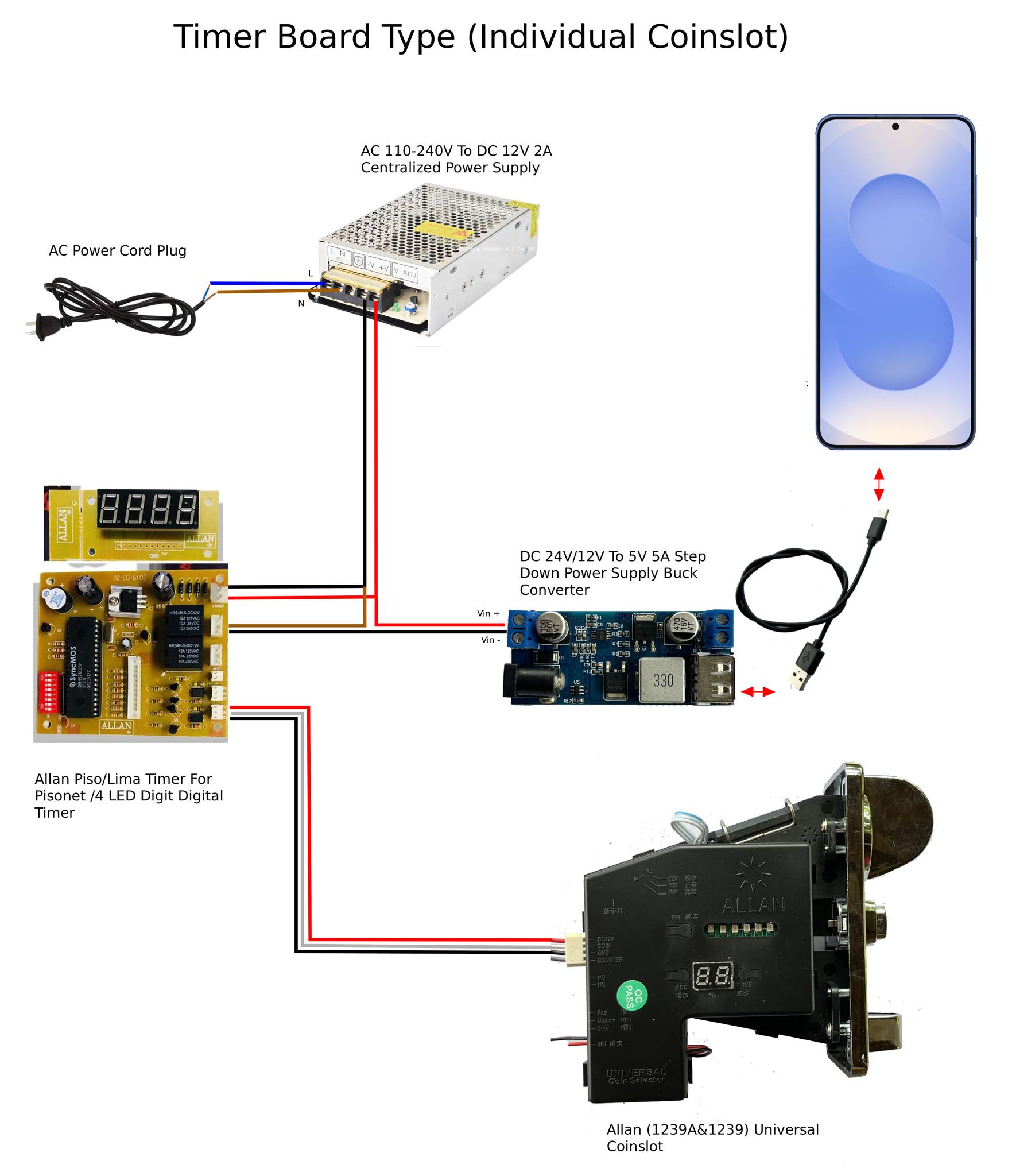 How it works: Coinslot triggers Allan timer → Timer controls power via buck converter → Converts to USB 5V → Powers and charges the rental phone directly.